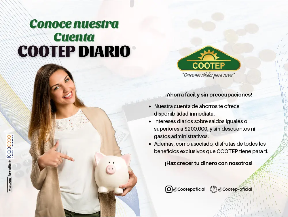 COOTEP DIARIO: Son los dineros colocados por los asociados, exigibles a la vista con rendimiento liquidado sobre saldo diario. Los intereses liquidados se capitalizarán en la cuenta diariamente. No se reconocerán intereses sobre saldos inferiores a $200.000.